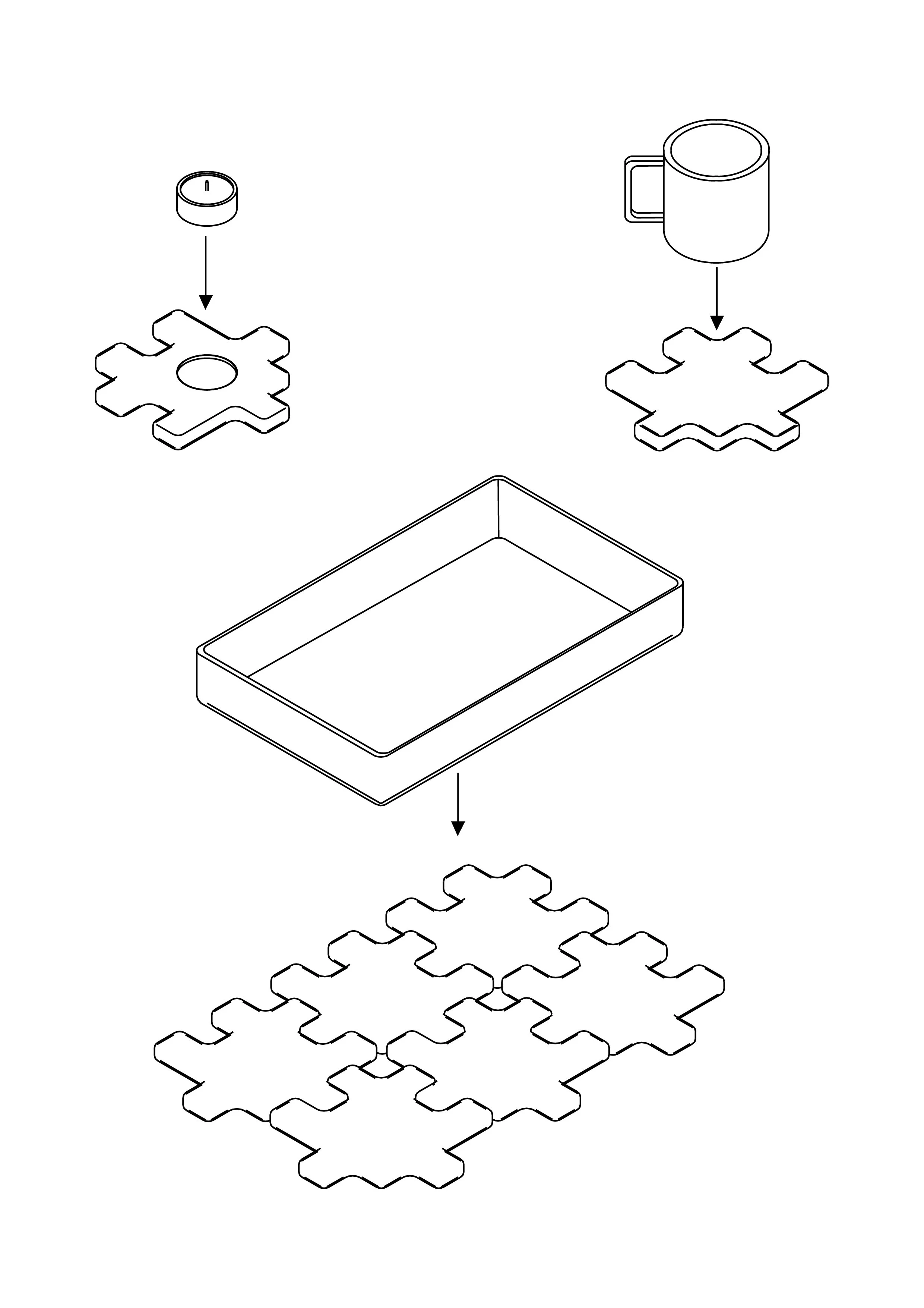 Það eru fjórir bollar í hverju stelli og með þeim fylgir diskur sem heldur þeim saman. Þegar þeir eru allir saman á diskinum þá sést ekki að séu hákarlar fyrr en einn þeirra er tekinn í burtu frá disknum. Aukahluturinn er tvöfaldur diskur er hægt að nota til að stafla öðru stelli ofan á hitt og væri því hægt að stafla mörgum stellum ofan á hvert annað til að gera turn.